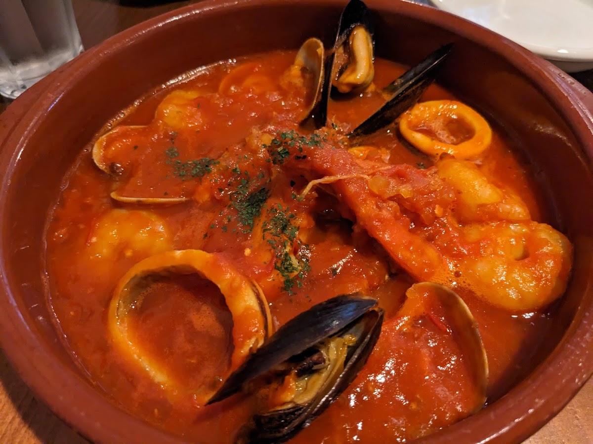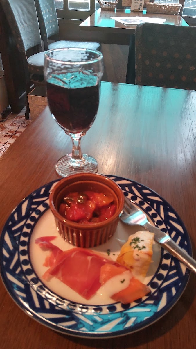 Was walking to Parco when I saw this restaurant. Incidentally, I had been craving paella for a week and their lunch set paella was just what I wanted. It is at the second floor of pet paradise, and when you enter, the interiors look like a rural house with the hewn walls that were kind of cavelike. Their staff was very helpful and kind. The lunch set has three regular paella (seafood, paella negra, and vegetarian), and a paella for the day (today there was Conger eel). For additional, you get appetizer and a drink. The appetizer was really good - I believe it was jamon, and a salmon. The paella was just right for one person, cooked in a little paellera that was thin enough for the soccarat to be there.